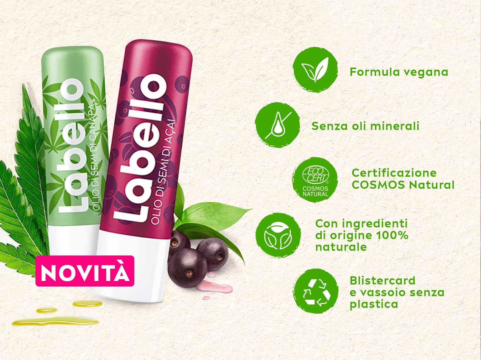 La formula di questi nuovi Labello è 100% vegana*, per labbra morbide e idratate in modo super naturale. Potrai scegliere tra 2 Oli naturali con 2 formulazioni diverse per le tue labbra: Olio di Semi di Açai e Burro di Karité biologico e Olio di Semi di Canapa e Burro di Karité biologico.
