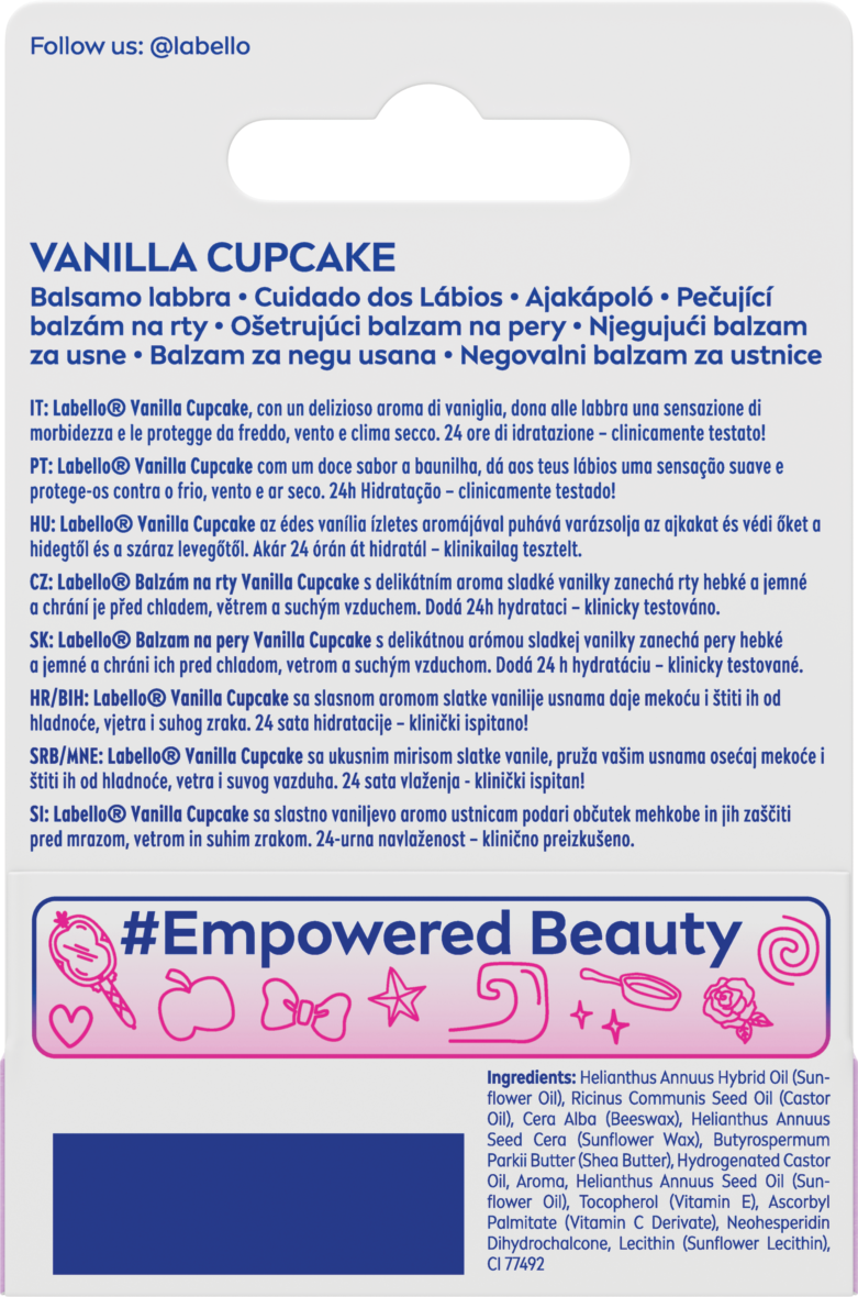 Incluso: Ricinus Communis Seed Oil, Cocoglycerides, Caprylic/Capric Triglyceride, Octyldodecanol, Hydrogenated Rapeseed Oil, Glycerin, Butyl Methoxydibenzoylmethane, Ethylhexyl Salicylate, Helianthus Annuus Seed Cera, Ethylhexyl Triazone, Hydrogenated Castor Oil, Polyglyceryl-3 Diisostearate, Aqua, Sodium Hyaluronate, Tocopherol, Ascorbyl Palmitate, Helianthus Annuus Seed Oil, Aroma, Magnesium Stearate, Sodium Chloride, CI 42090, Sodium Sulfate